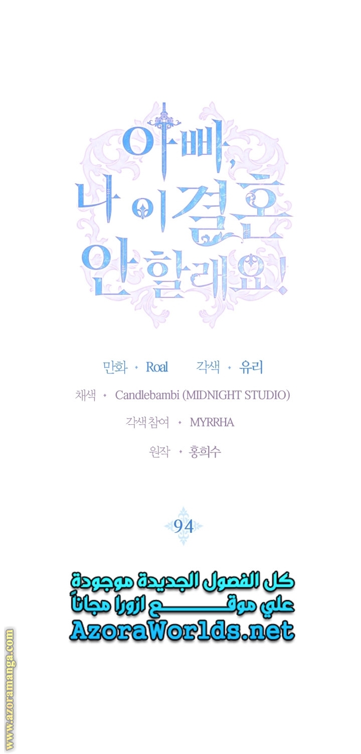 Father, I Don’t Want to Get Married! الفصل 94 يتضمن 98 صفحة كوميك في ترتيب القراءة الرئيسي. نُشر 30 دجنبر 2022 و آخر تحديث 30 دجنبر 2022.