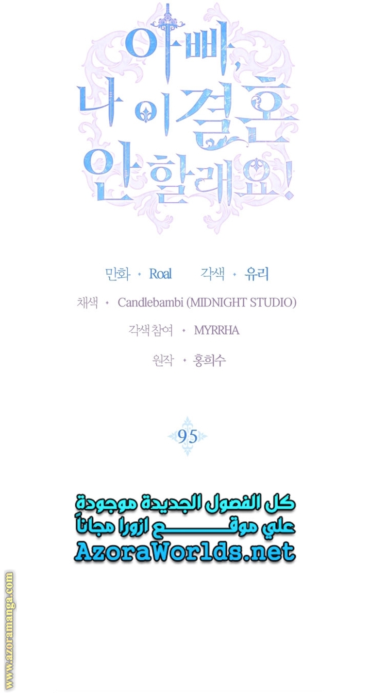 Father, I Don’t Want to Get Married! الفصل 96 يتضمن 98 صفحة كوميك في ترتيب القراءة الرئيسي. نُشر 12 يناير 2023 و آخر تحديث 12 يناير 2023.